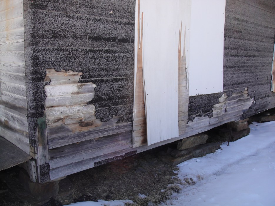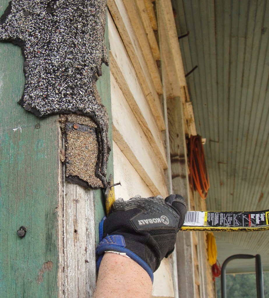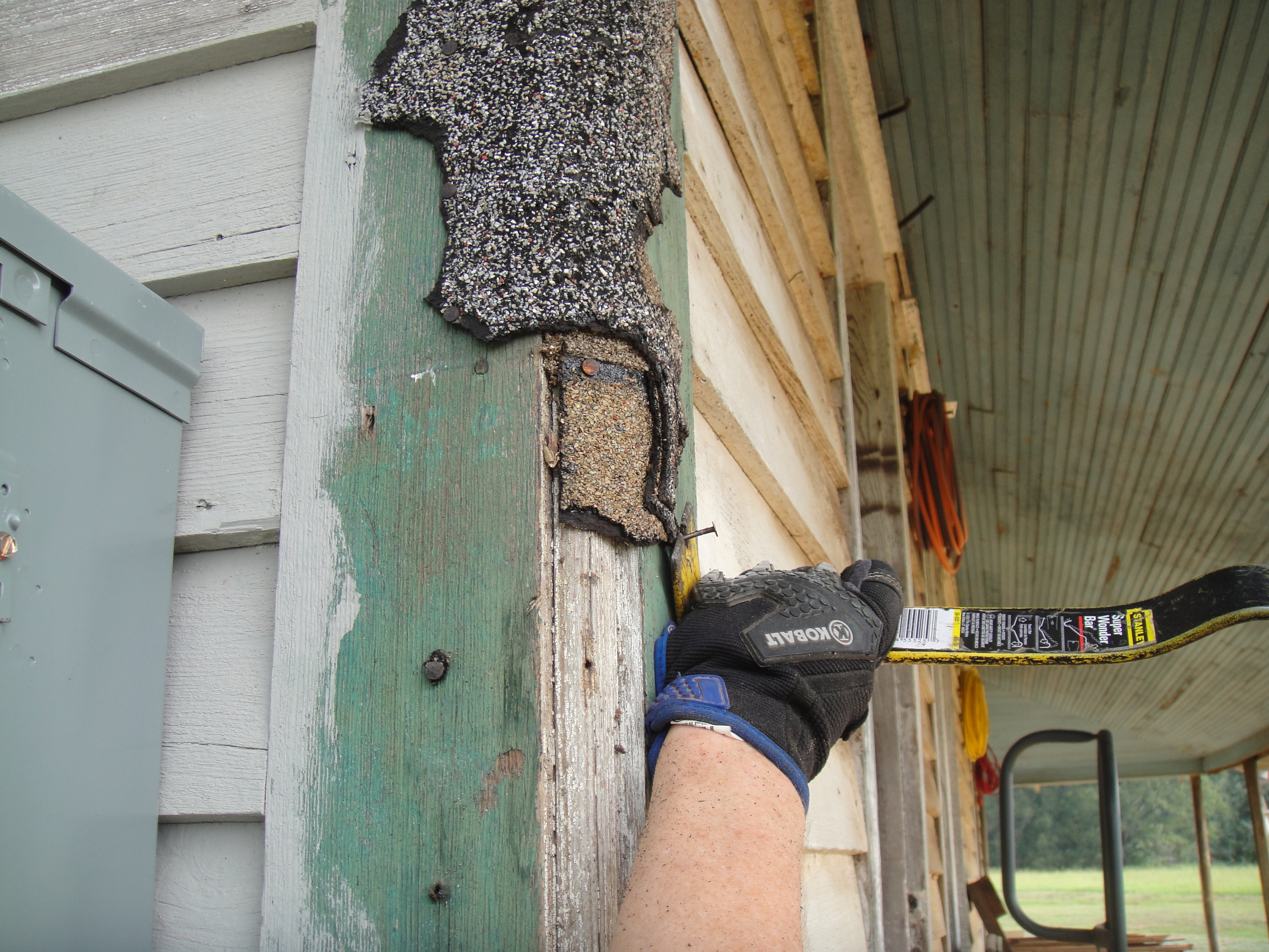 A long, long time ago, someone decided that asphalt shingles were such a great idea that they would invent a product that allowed people to encase their entire house in asphalt shingles! I kid you not. Imprinted to look like bricks and sold in two by four foot sheets, asphalt siding was a popular product when it was first introduced during the Great Depression (Never Paint Again!) and remained available until about 1950. Jane Doe was covered with the stuff when we started our project. Installed at least 70 years ago, it did an admirable job of protecting the original clapboard underneath, but at an ugly price. It was decayed, looked abysmal and had to go before our renovation project could proceed.